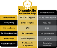 Si vous êtes à la recherche d'un véritable shilajit naturel, SHAMBALLA® s'avère être le meilleur choix. Nous sommes une marque française 100% spécialisée dans la sélection, l'importation et la distribution de shilajit de très haute qualité provenant directement des Hautes Montagnes de l'Himalaya. C'est parce que nous entretenons des liens privilégiés avec les meilleurs producteurs locaux que nous sommes en capacité de vous fournir un shilajit authentique, pur et contrôlé. Chez SHAMBALLA® votre bien-être est notre priorité !